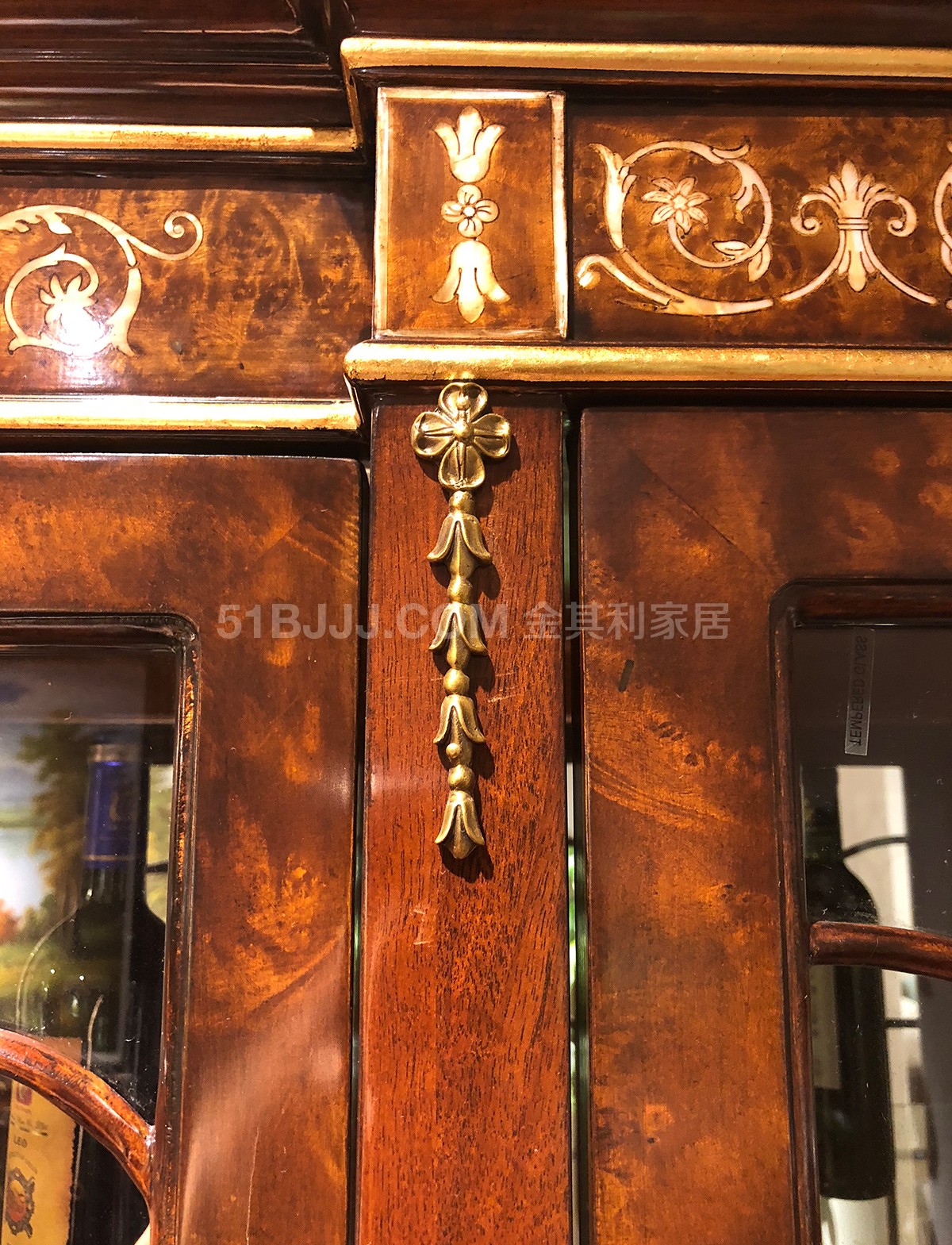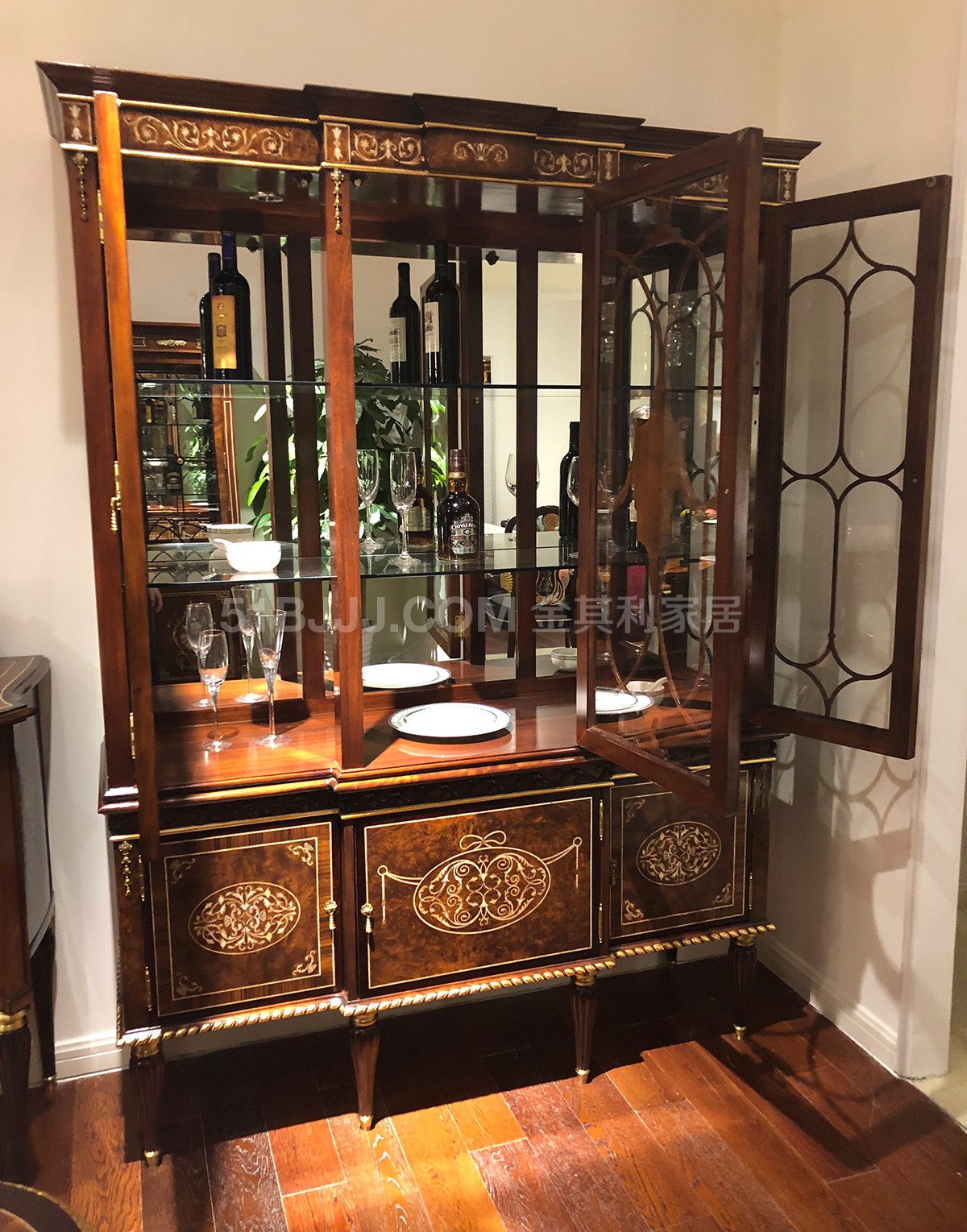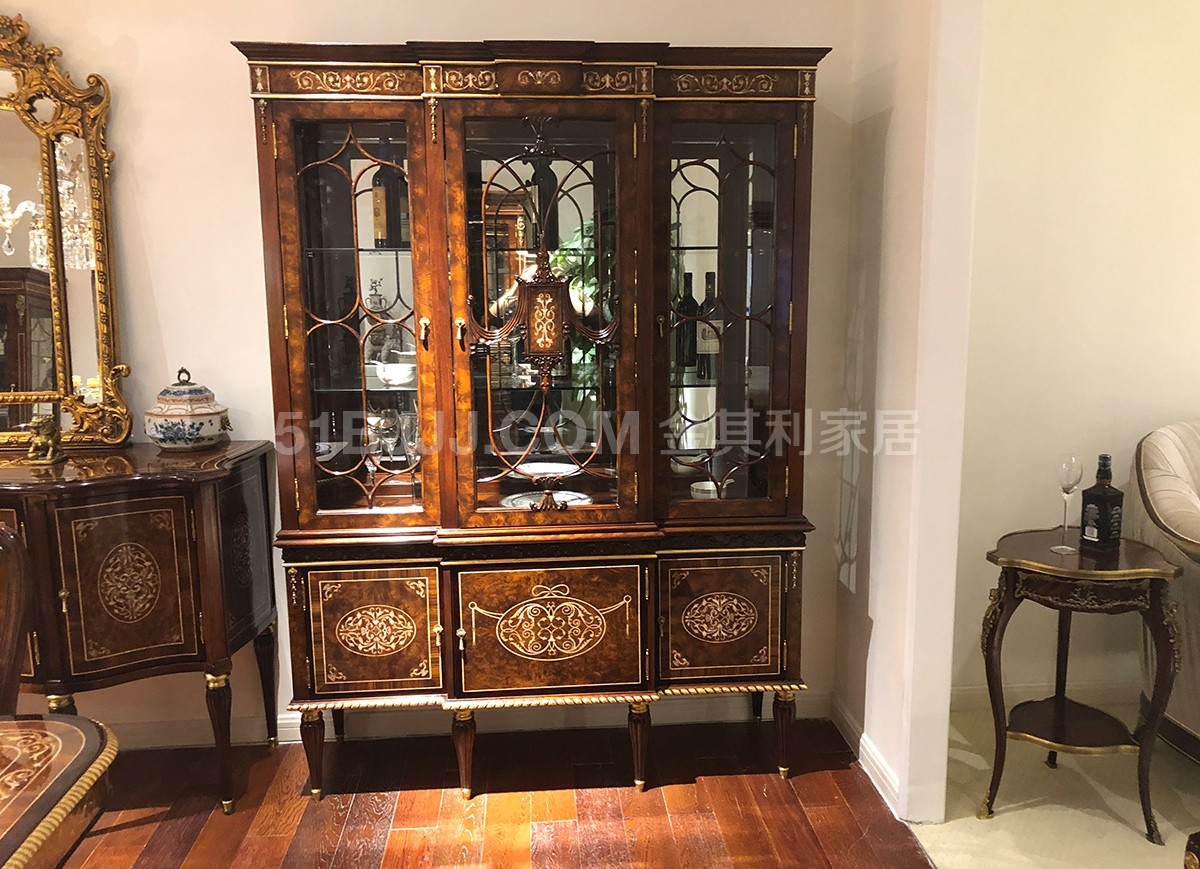 金其利家具英式餐廳酒柜亞歷山大三門酒柜貝殼鑲嵌實拍