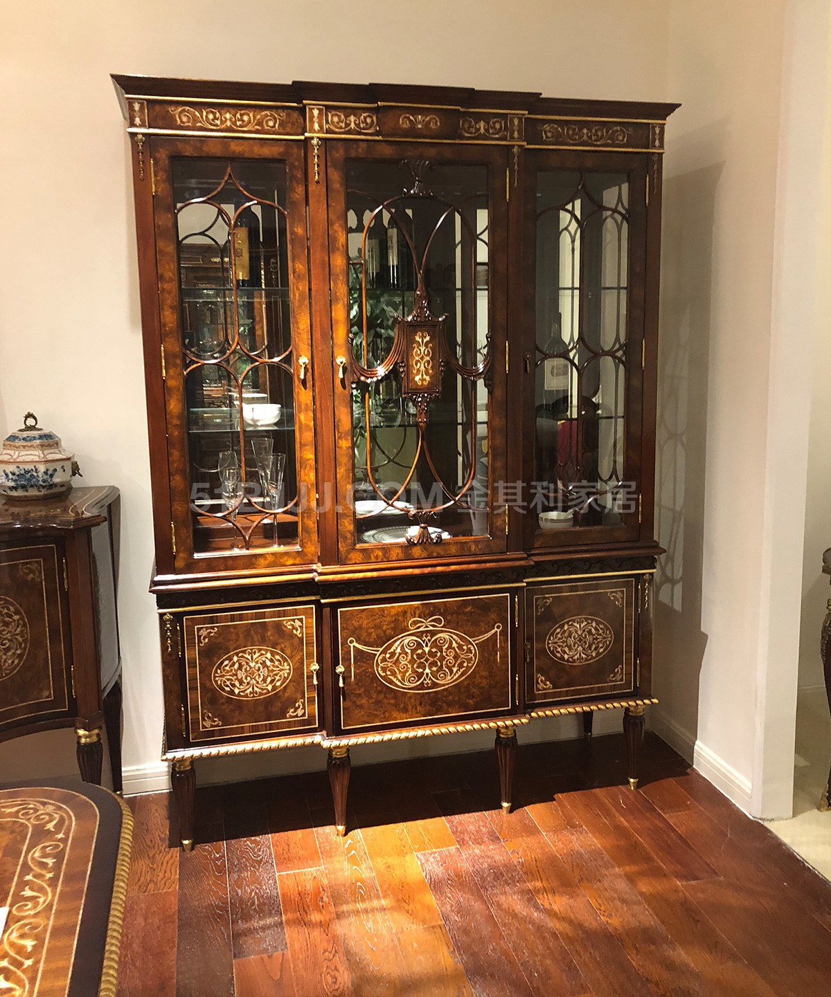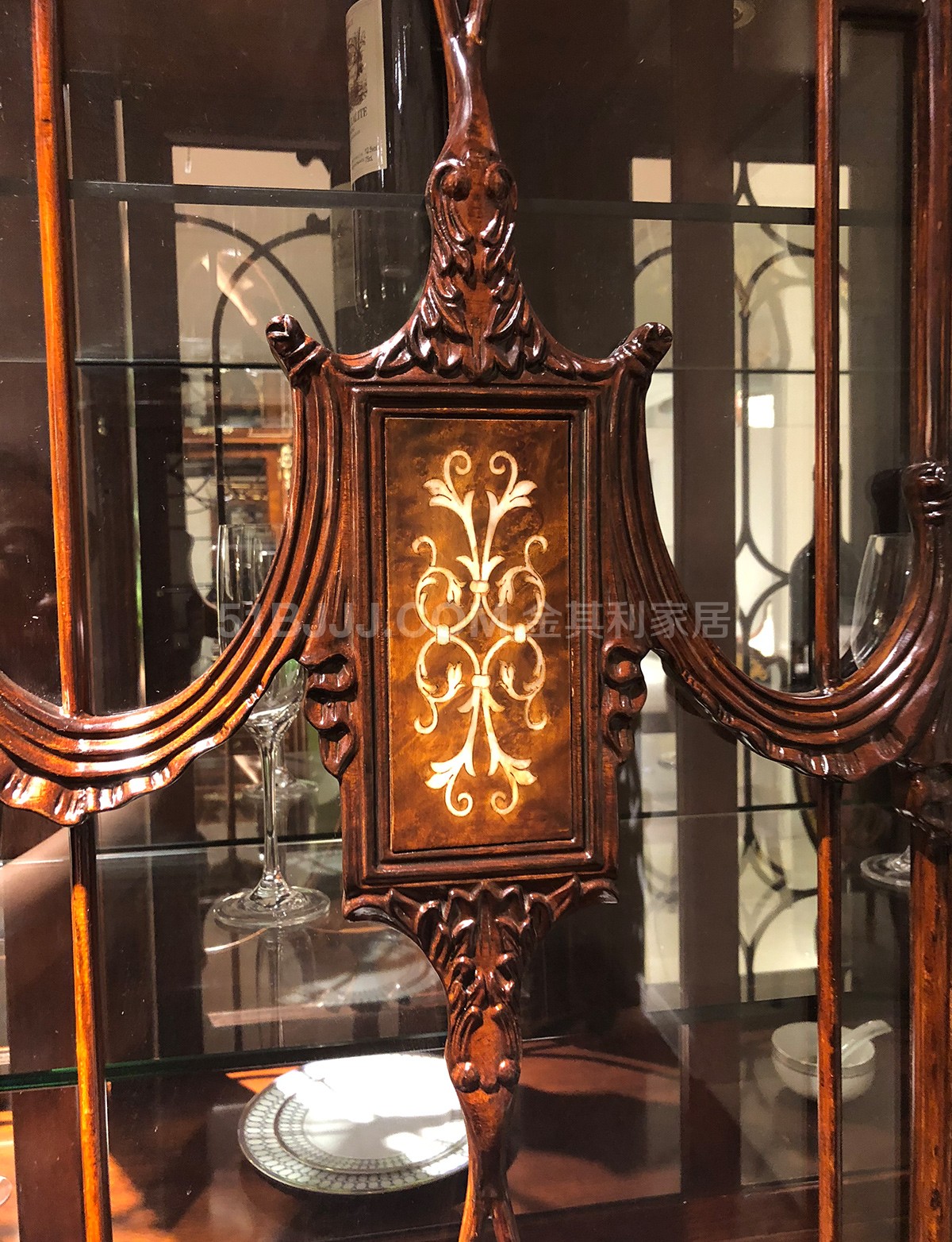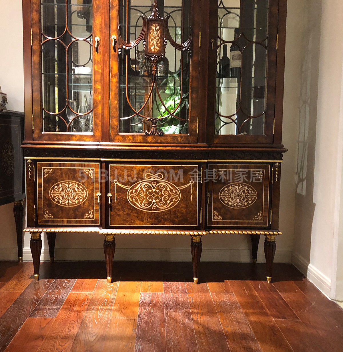金其利家具英式餐廳酒柜亞歷山大三門酒柜貝殼鑲嵌實拍
