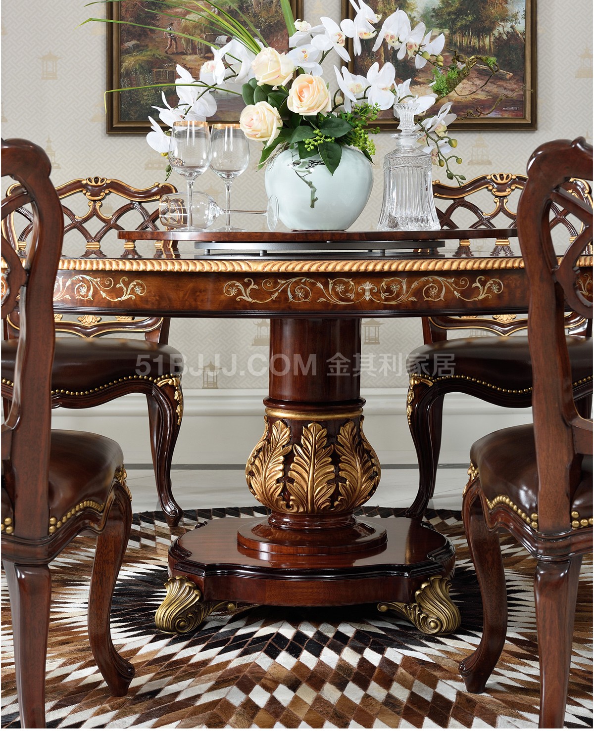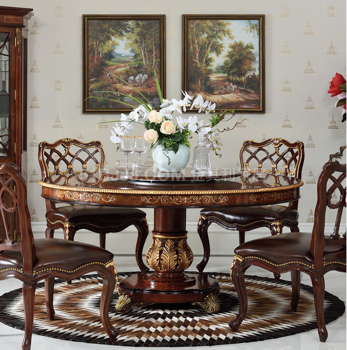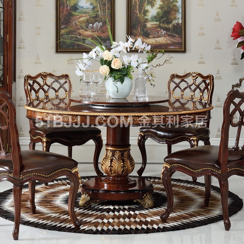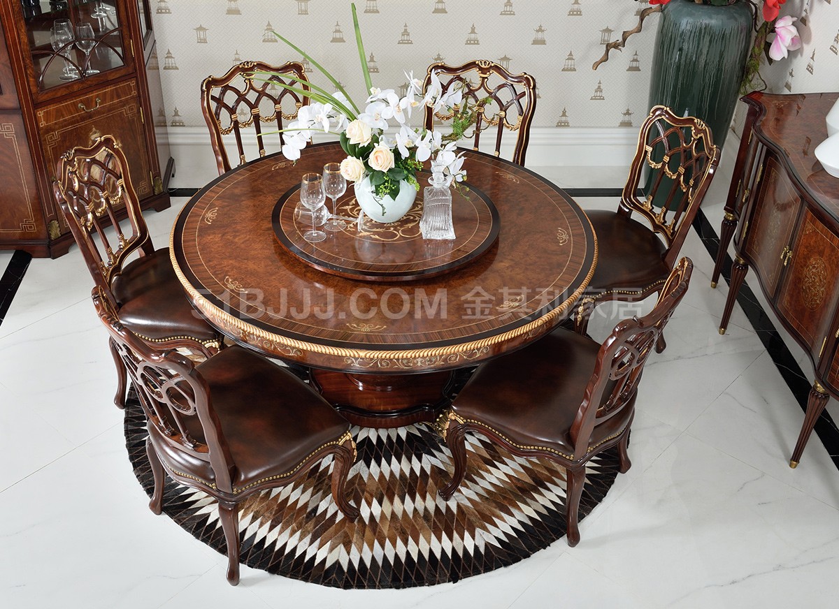 桃花心木貝殼鑲嵌圓桌 皇室英式歐式實木餐廳組合