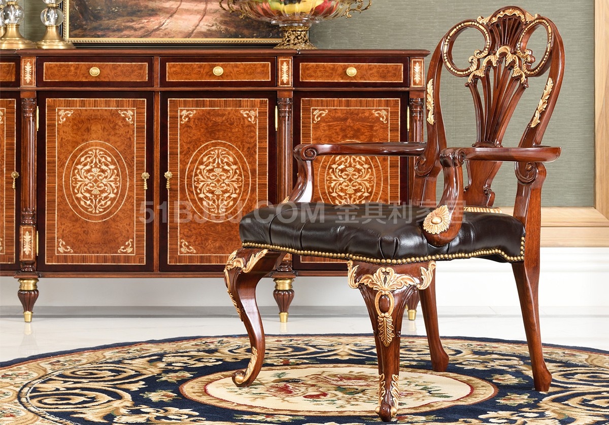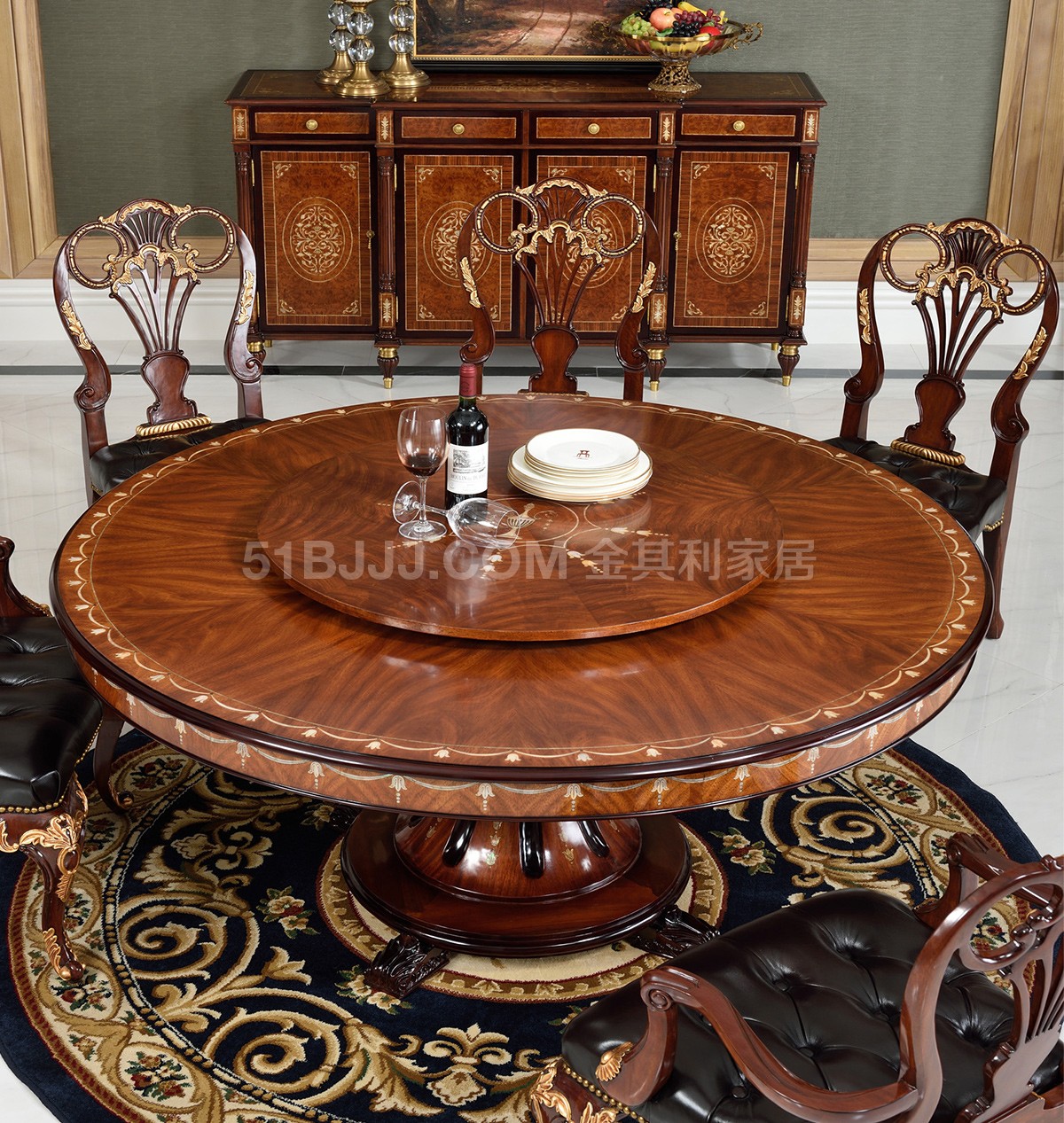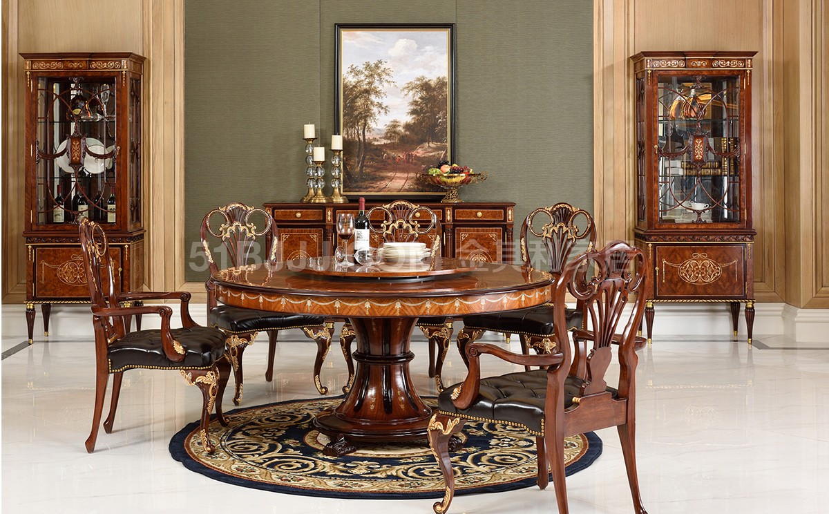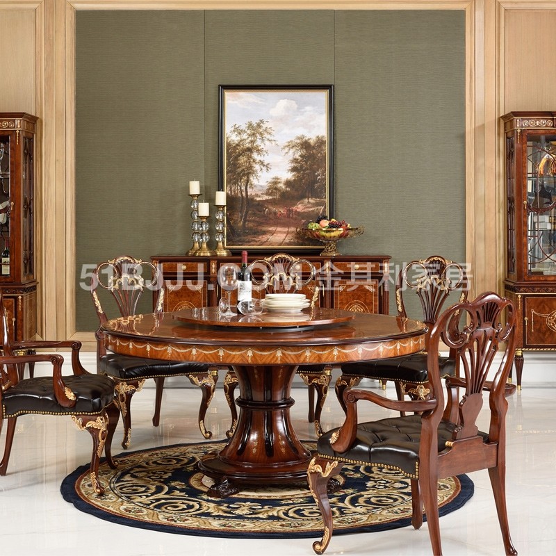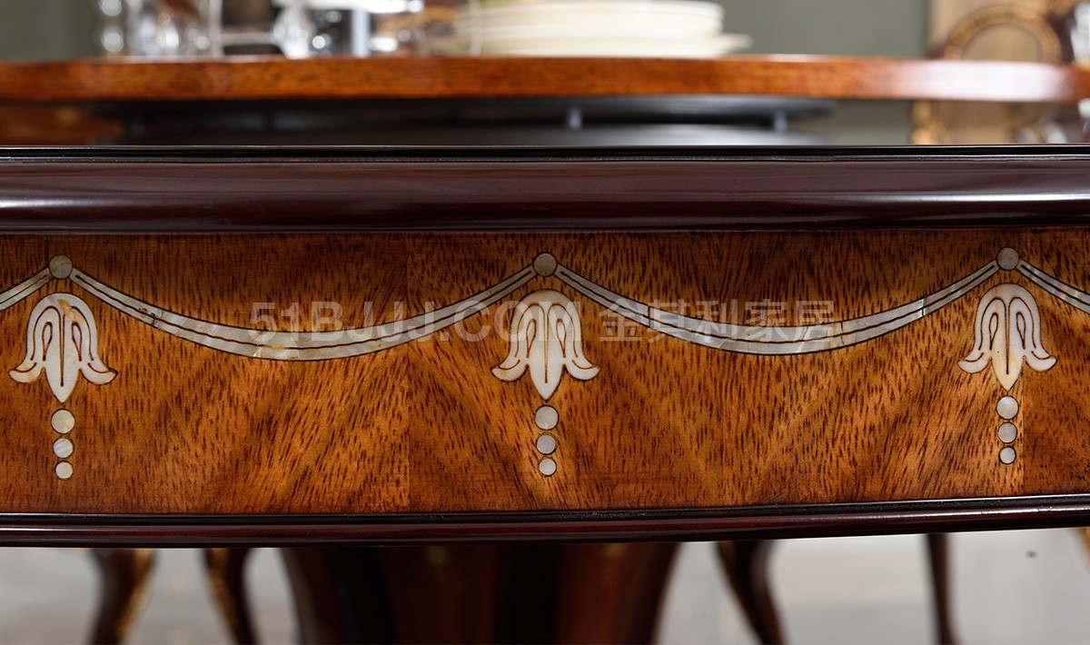 桃花心木貝殼鑲嵌圓桌 英式歐式皇室實木餐廳餐桌椅組合