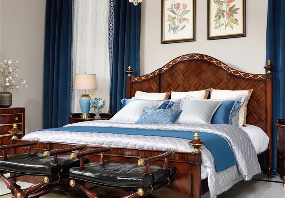 貝殼鑲嵌黃銅裝飾實木床(chuang) 英式古堡 桃(tao)花心木 臥室套裝